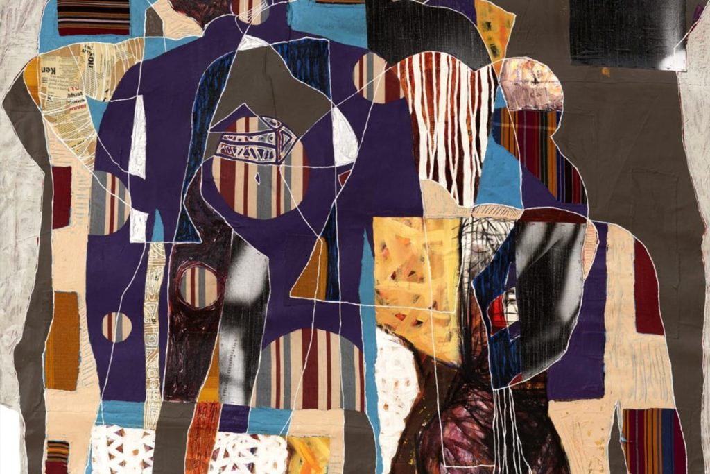 In his collages, Collin Sekajugo (b. 1980, Masaka, Uganda) examines the interaction of social, cultural, economic, and political factors which shape individual and collective identities. To create his works, he utilises polypropylene bags, denim fabrics, wastepaper, and product labels gathered locally. A metaphor for sustainability and durability, these materials aim to spark a conversation about the relationship between art and community. Through his art, Sekajugo also strives to establish a dialogue with the spectator on discrimination and violence, hoping for his audience to gain a more expansive and nuanced understanding of what living in community means.