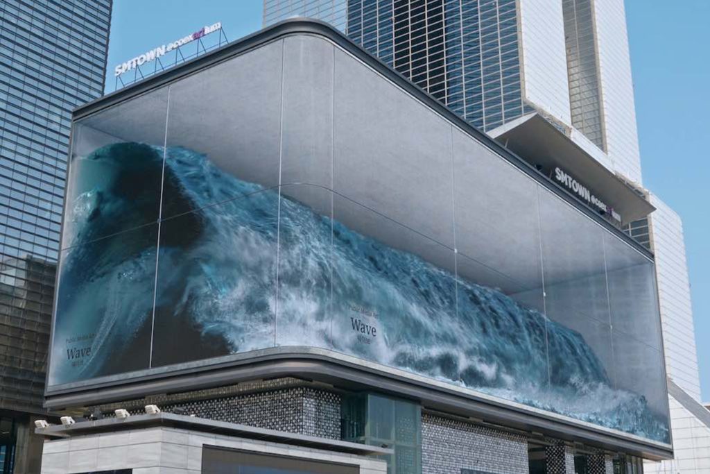 A digital media artwork striking a viewer’s imagination, WAVE is a 2D installation that debuted at COEX K-Pop Square, Seoul, in 2020. It displays a huge 3D wave constantly surging inside a large LED screen: an outdoor billboard. Using the anamorphic effect (when one has to view a space from a particular vantage point to properly see an image, otherwise it appears distorted), d’strict has made its WAVE look like a real water mass contained in a gigantic aquarium and ready to crash the glass and spill over. “It is particularly meaningful to showcase WAVE, a work based on water, in […] a desert city,” Sean Lee, CEO of d’strict, says. “[…] We hope that WAVE will […] bring comfort and solace to the citizens of Abu Dhabi.”
