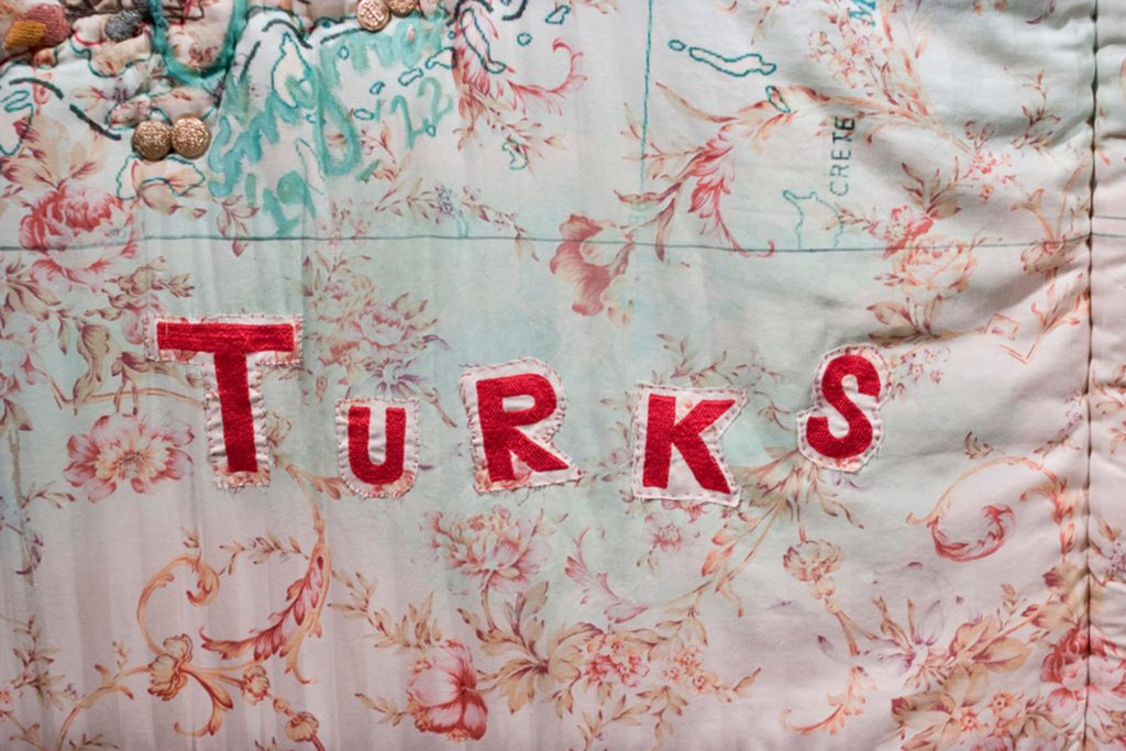 An interesting description of her artworks can be found in the presentation of the exhibition: “…Syed weaves the history of the location-specific craft of textile production with tales of political resistance. All her quilts depict 20th-century maps of various port cities that were strategically located on the colonial European trade route such as Izmir in Turkey, Kandy in Sri Lanka, Mumbai in India, and Ras al-Khaimah in the U.A.E. Apart from being trade gateways, these cities were also sites of resistance and rebellion against imperial powers.”